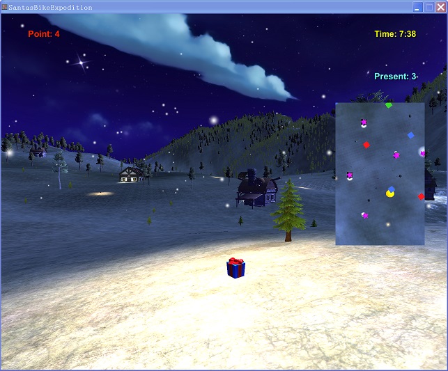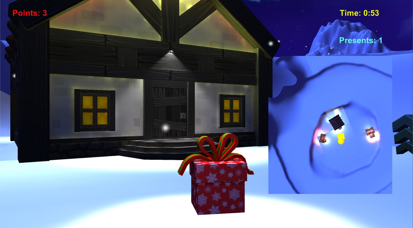 (Queenie’s message) "The goal of the game is to have the player bike around a map, collecting presents and delivering them to houses, within the time limit. Players can use the mini map, which have the house and present locations, as well as power ups such as speed boosters to help them complete the game".